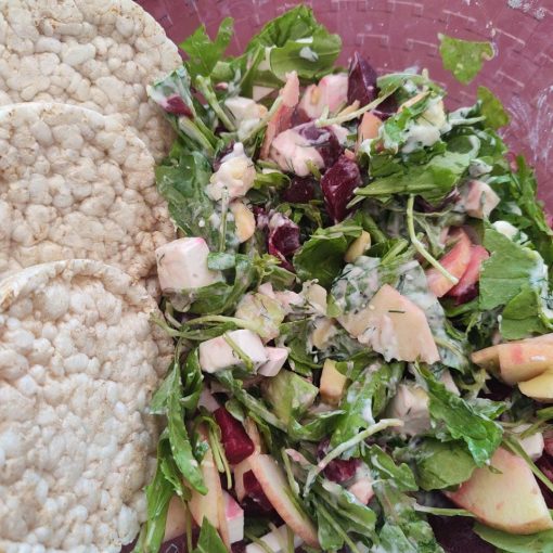 4. Alles zusammen mit Knäckebrot servieren, oder das Knäckebrot über den Salat bröseln.